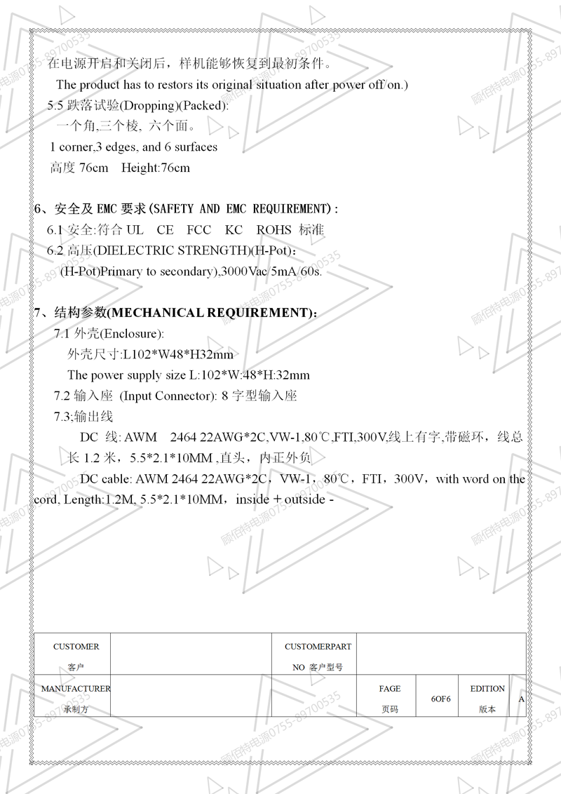 19V3.5A電源適配器規格書